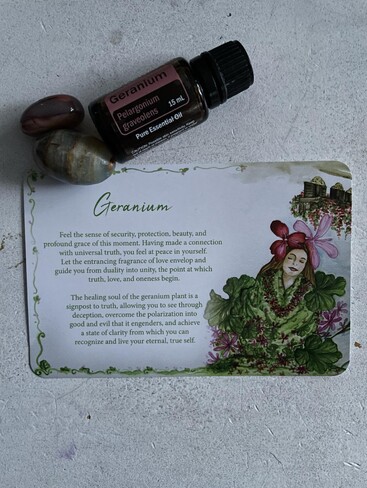 This week, I felt like being a bit random, so I shuffled my Essential Oils Oracle Cards and let the universe guide me to a card. The one that popped up? Geranium! It’s been a while since I’ve worked with this oil, so it was a pleasant surprise. This is what I love about combining essential oils with oracle card wisdom—there’s always something fresh and insightful to explore, whether it's with a specific deck like this one, where the oil is already chosen, or a more traditional deck where you can intuitively pick an oil based on the card’s energy. It’s a fun, creative way to deepen the practice.