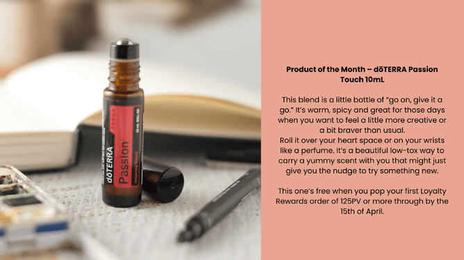 The Product of the Month (Passion Touch 10mL) is available for free when you place your first 125PV Loyalty Rewards order between 1–15 April 2025. Make sure it processes by 11.59pm MST on 15 April (that’s 5.59pm NZST on the 16th for us here in NZ). Only one freebie per account, and it needs to be a single order, not split across days.