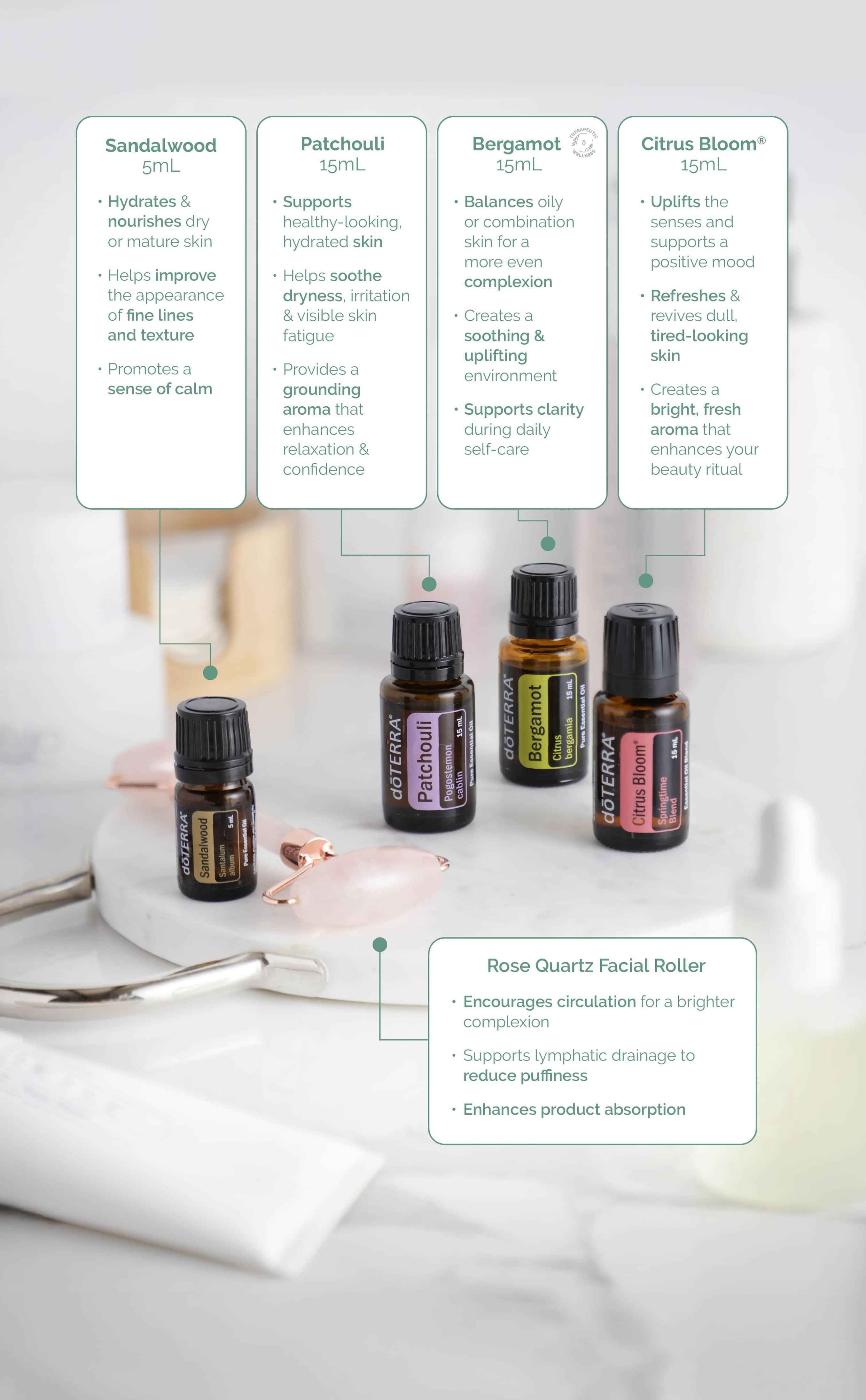 The Beauty Boost Kit is designed to enhance your skin, mood and beauty routine. Combining curated essential oils known for their beautifying and skin-loving properties with a Rose Quartz Facial Roller, it creates an immersive and sensory self-care experience you can enjoy in your own time.